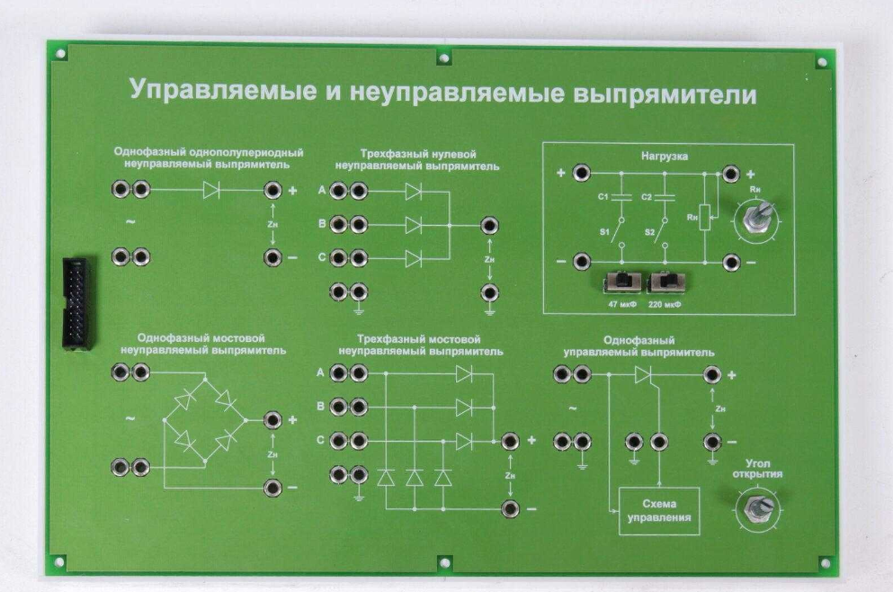 Сменная панель содержит необходимые объекты исследований: однополупериодный однофазный выпрямитель, двухполупериодный мостовой однофазный выпрямитель, однополупериодный трехфазный выпрямитель, двухполупериодный трехфазный мостовой выпрямитель (схема Ларионова), однофазный управляемый выпрямитель, а также эквивалент нагрузки с возможностью плавной регулировки сопротивления нагрузки и дискретной – емкости нагрузки.