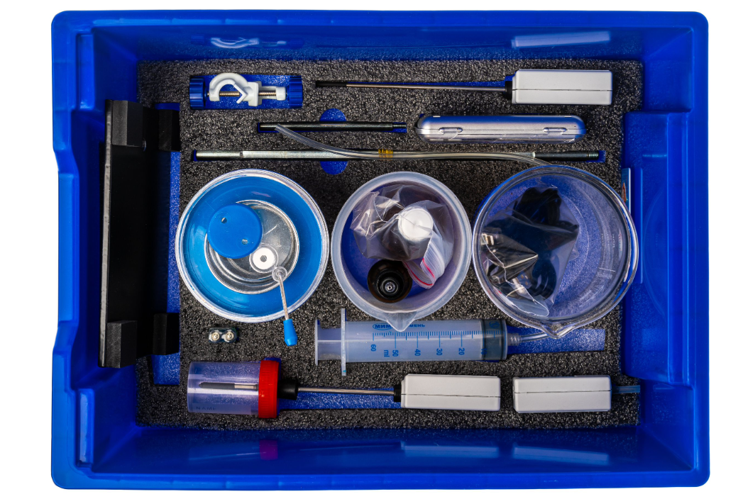 — Цифровой датчик температуры (диапазон измерений от -20 до +110 градусов Цельсия) (2 штуки) — Цифровой датчик абсолютного давления (диапазон измерений от 0 до 200 кПа) — Штатив — Весы учебные электронные (максимальный предел взвешивания 200 грамм) — Стержень для закрепления датчиков в штативе — Емкость с крышкой — Калориметр — Трехкомпонентный шприц объемом 50 мл — Стаканы объемом 800 мл и 500 мл — Трубка со штуцером — Палочка для перемешивания — Глицерин (50 мл) во флаконе — Методическое обеспечение на русском языке — Программное обеспечение для проведения экспериментов — Система хранения