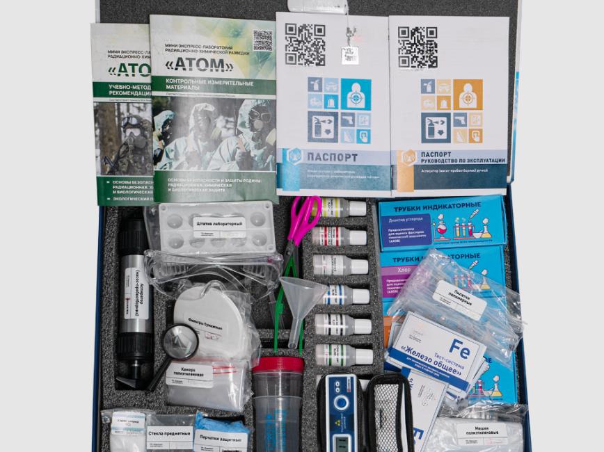 Мини-экспресс-лаборатория радиационно-химической разведки "Атом" - это компактный и многофункциональный учебный набор, предназначенный для исследовательских работ и практических занятий по обнаружению и оценке факторов радиационной и химической опасности, оценке состояния объектов окружающей среды и здоровья человека в рамках учебного предмета "Основы безопасности и защиты Родины" (ОБЗР).