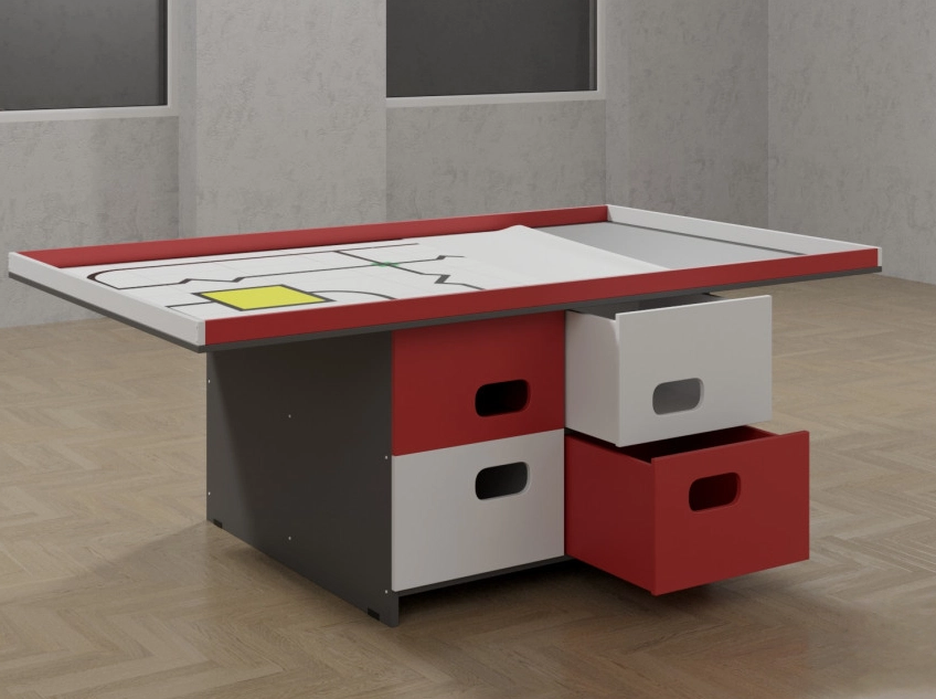 Перед вами замечательный стол для роботостроения, который сделает процесс взаимодействия малыша с роботами проще и удобнее. Специальная конструкция стола позволяет удобно разместить на его поверхности все нужные элементы, при этом сохранив необходимое свободное пространство. Столешница довольно большая и просторная. Это позволит детям чувствовать себя свободно в движениях при конструировании. Бортики столешницы приподняты для того, чтобы малыш случайно не уронил детали на пол. Также у стола имеются четыре вместительных ящика, в которых могут хранится необходимые для работы материалы, пособия, детали и игрушки. Это позволит не заваливать столешницу всем подряд и поддерживать порядок на столе. Интересные цвета и прекрасное качество сборки поможет детям по полной наслаждаться процессом конструирования любимых роботов.