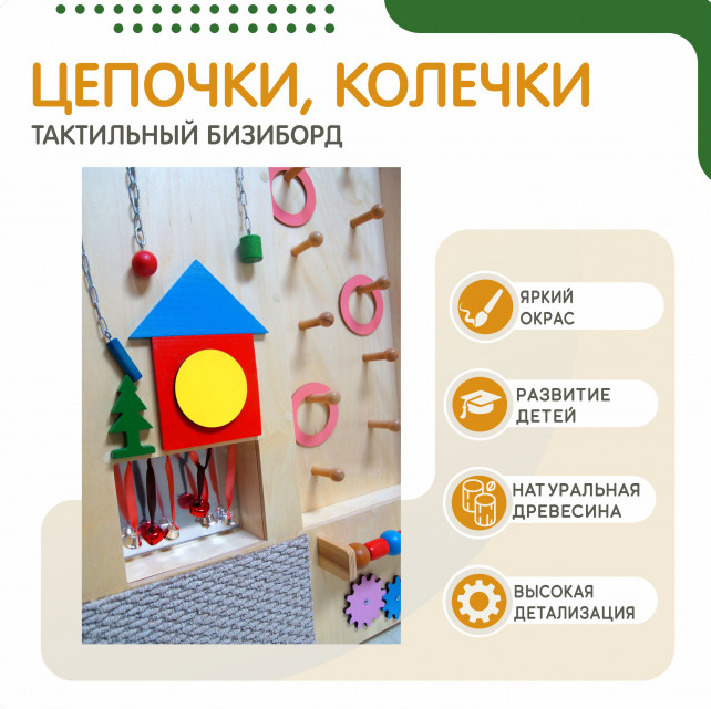 - Бизиборд Цепочки-колечки развивает тактильные ощущения, моторику и координацию движений у ребенка.