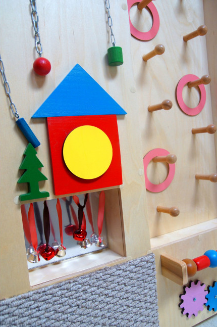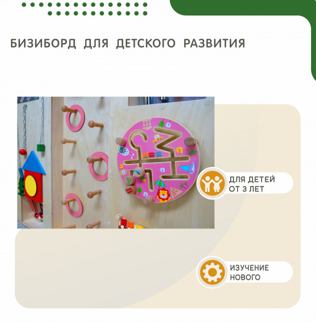 - Бизиборд с цепочками-колечками отлично подходит для игры как в домашней обстановке, так и в детских учреждениях.
