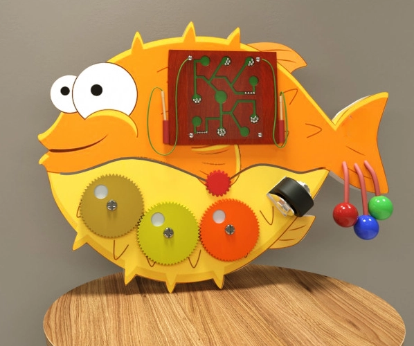 Бизиборд представленной модели – оптимальное решение для небольших помещений. Выполнен в форме колючей жёлто-оранжевой Рыбы-ежа, на которой размещены разнообразные приспособления для весёлой и интересной игры. Все края закруглены и обработаны по специальной технологии, что гарантирует безопасность в использовании даже самыми маленькими детками.