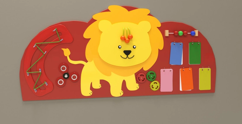 Настенная панель со львом — это компактный детский игровой модуль. Основа выполнена в виде красного «облачка», на котором размещён Львёнок и прочие интересные приспособления для весёлой игры. Поверхность обработана специальным образом и имеет многослойное покрытие из экологически безопасных материалов.