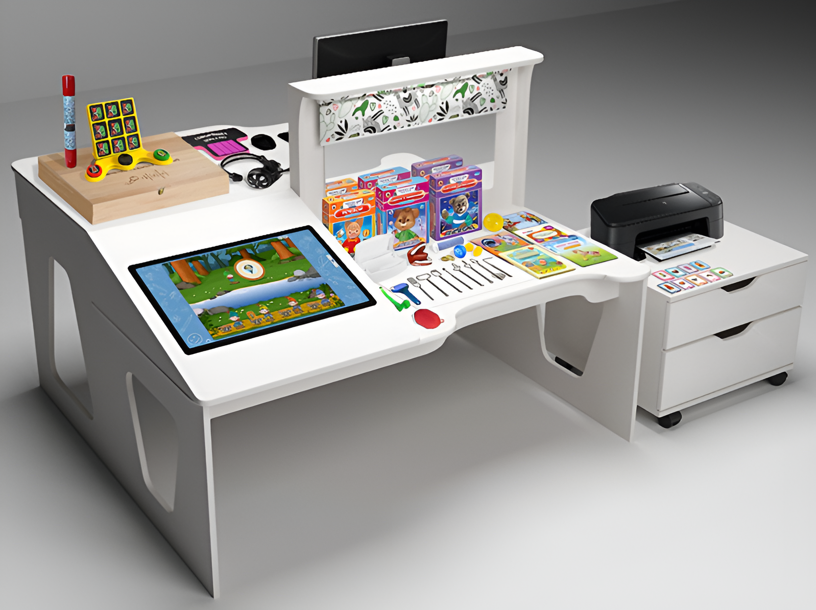 Профессиональный стол логопеда "Лого-Про Макс+" оснащен компьютером, мультисенсорной панелью, а также специальным набором для детей аутистов предназначен не только для эффективных занятий с детьми по программе коррекции речи, но и специализированных занятий для детей с синдромом ОПА (ДЦП).