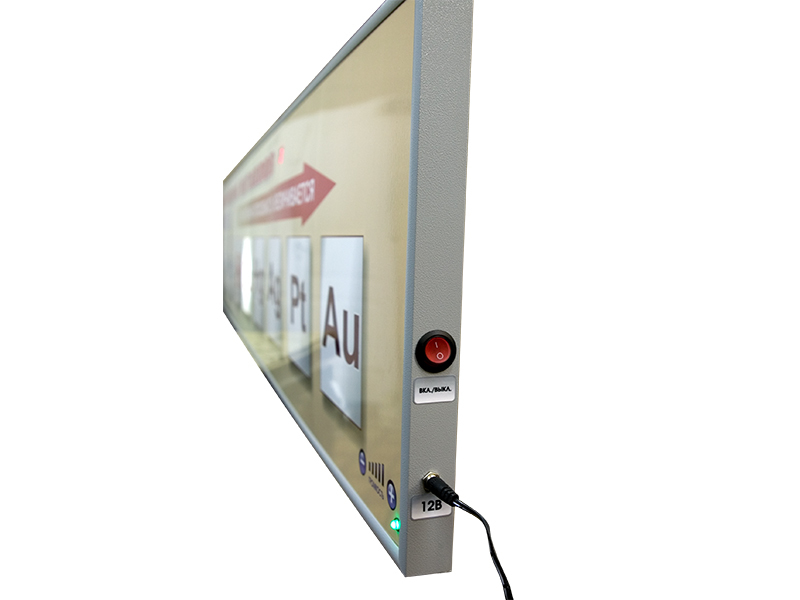 Справочно-информационный стенд представляет собой панель с раздельной световой индикацией. На стенде размещен электрохимический ряд напряжений металлов. Справочно-информационный стенд предназначен для наглядной работы с таблицей "Электрохимический ряд напряжений металлов" в образовательных учреждениях на занятиях по химии, физике и другим предметам, при изучении которых необходима информация о свойствах различных химических элементов. В комплект поставки входит сенсорный беспроводной пульт дистанционного управления, при помощи которого на стенде можно высвечивать отдельные элементы таблицы. "Виртуальный учитель" – голосовое сопровождение, с помощью которого специально разработанная программа рассказывает ученикам выбранный учителем материал (основы химии, назначение таблицы "Электрохимический ряд напряжений металлов" и правила ее эксплуатации). Выбор компонента, о котором информирует "Виртуальный учитель", происходит при помощи сенсорного беспроводного пульта дистанционного управления. Громкость "Виртуального учителя" изменяется при помощи сенсорного регулятора громкости, расположенного на лицевой стороне стенда.
